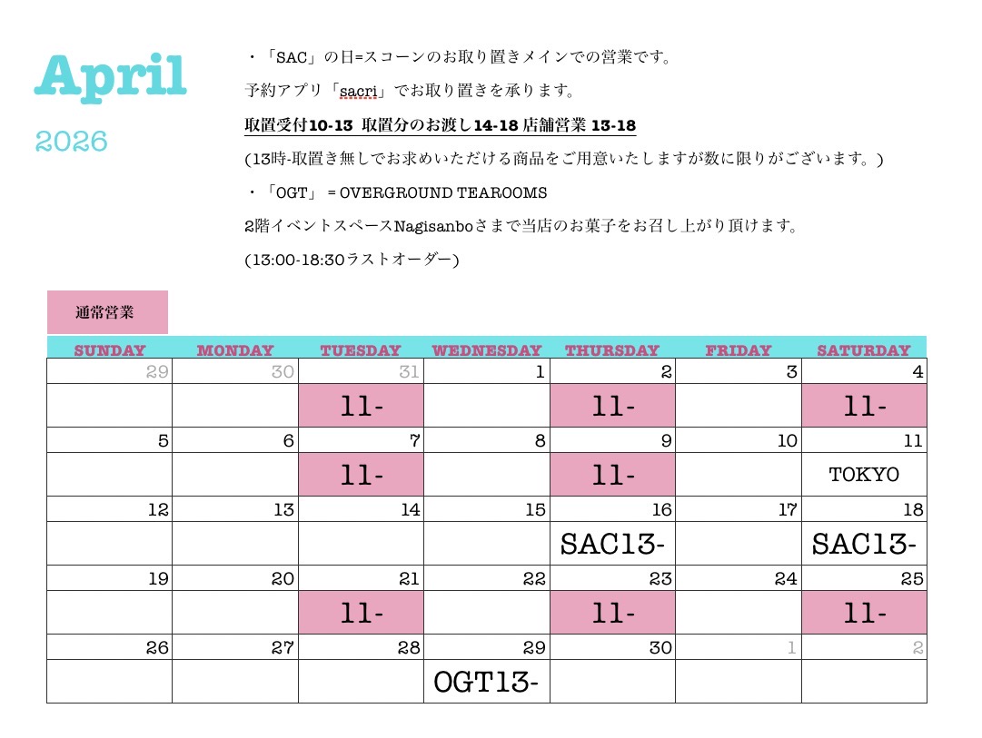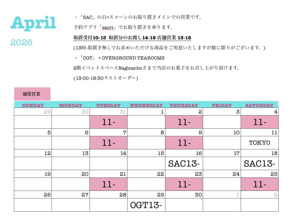 お取り置きの日(カレンダーの「SAC」)は基本的にスコーンのみ販売致します。スコーンを確実に買いたい!という皆様はこちらのご利用をご検討くださいませ。お取り置きは予約アプリ「sacri」から承ります。